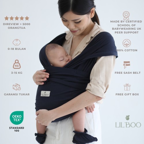 LIL’ BOO Gendongan Bayi Instan M-Shape 0–15kg Navy | Baby Wrap Newborn + Gift Box + Sash Belt