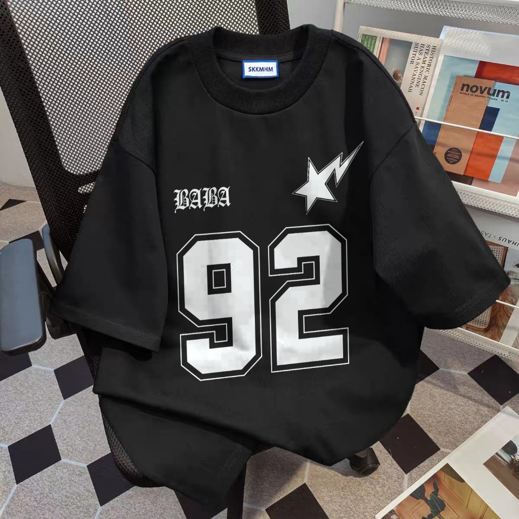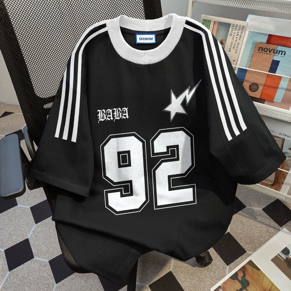 SEZO Baju Wanita Putih Black Kaos Premium Lengan Pendek Oversize Kemeja Lengan Pendek Putih Tiga Garis Nomor 92 Atasan W
