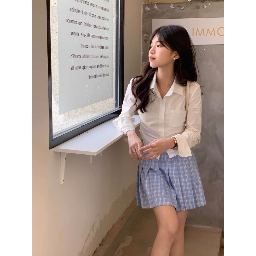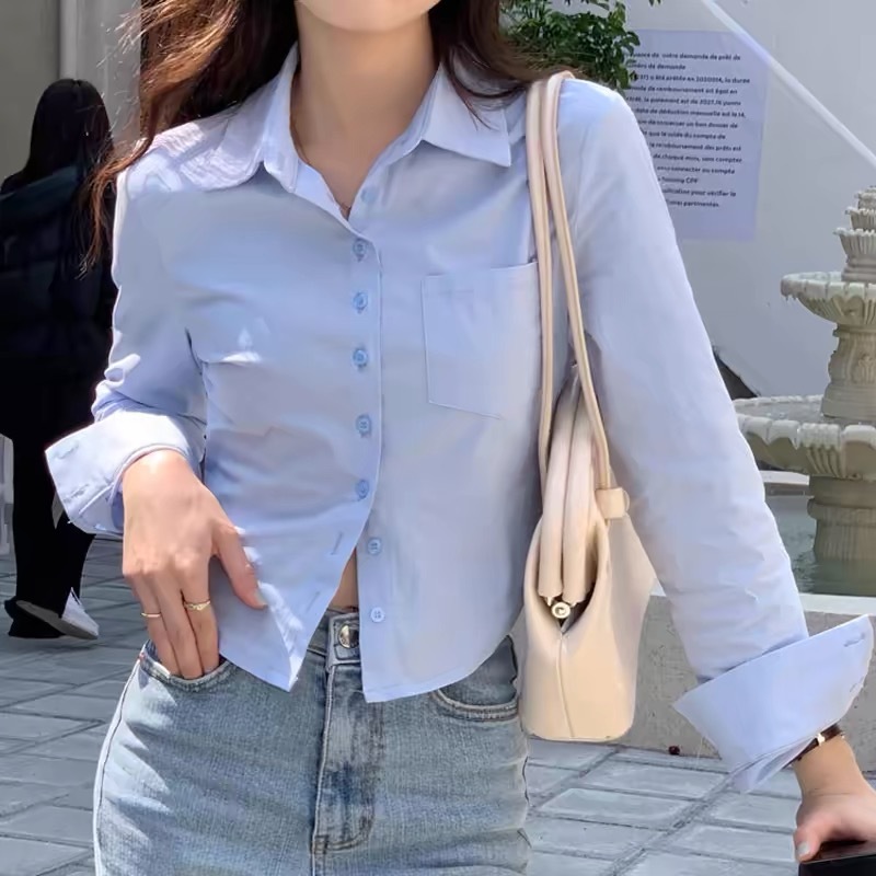 Kerah Kancing Lengan Panjang Kemeja Wanita Gaya Korea Retro Atasan Kemeja Biru