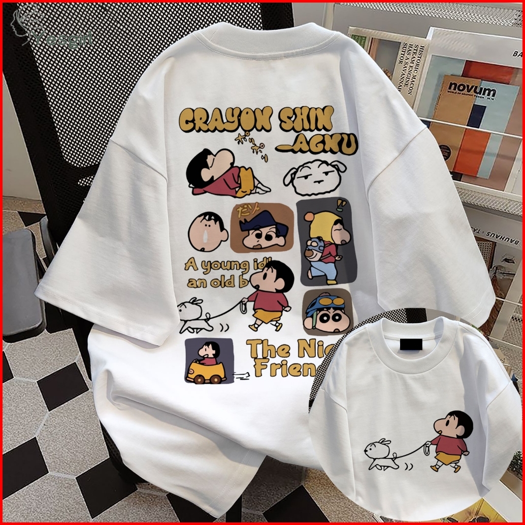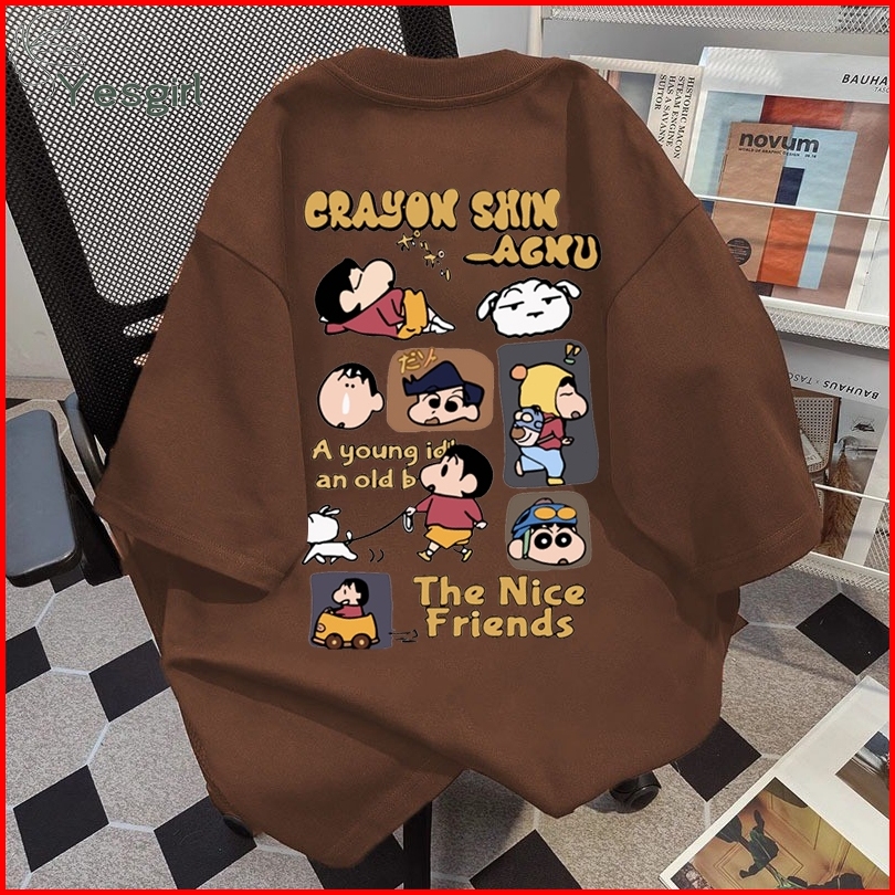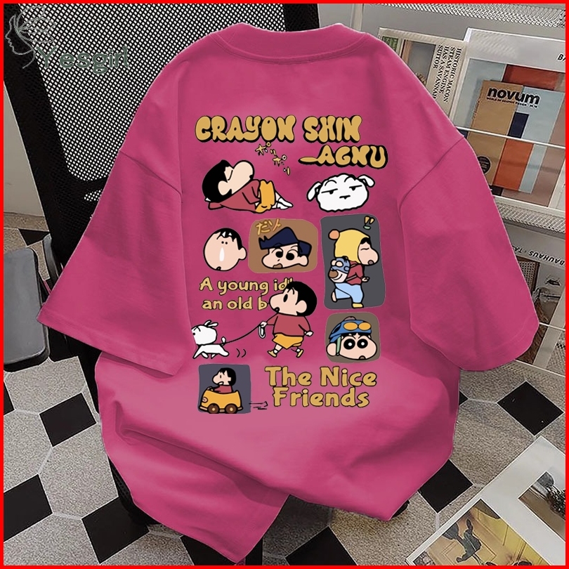 Yesgirl Korea Style Crayon Shin-chan Mengajak Anjingnya Jalan-jalan Print Kaos Kasual Longgar Kaos Oversize Wanita Fashi
