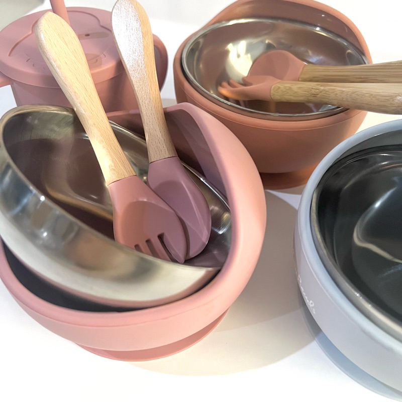 Chew Beads - One Tone Color Lunch Set | Suction Bowl Silicone | Mangkok Suction Silikon | Stainless Bowl | Mangkok Stainless Anak | Alat Makan MPASI Silikon | 1 Set Peralatan Makan Bayi