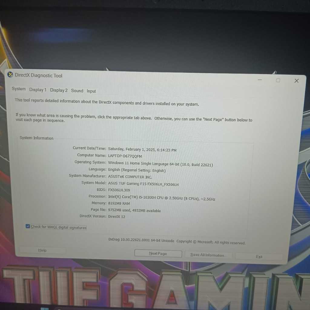 Laptop Asus TUF Gaming F15 FX506L, Intel i5-10300H, 8/512Gb, #Vga GeForce GTX 1650 4Gb, Lengkap, Black Silver