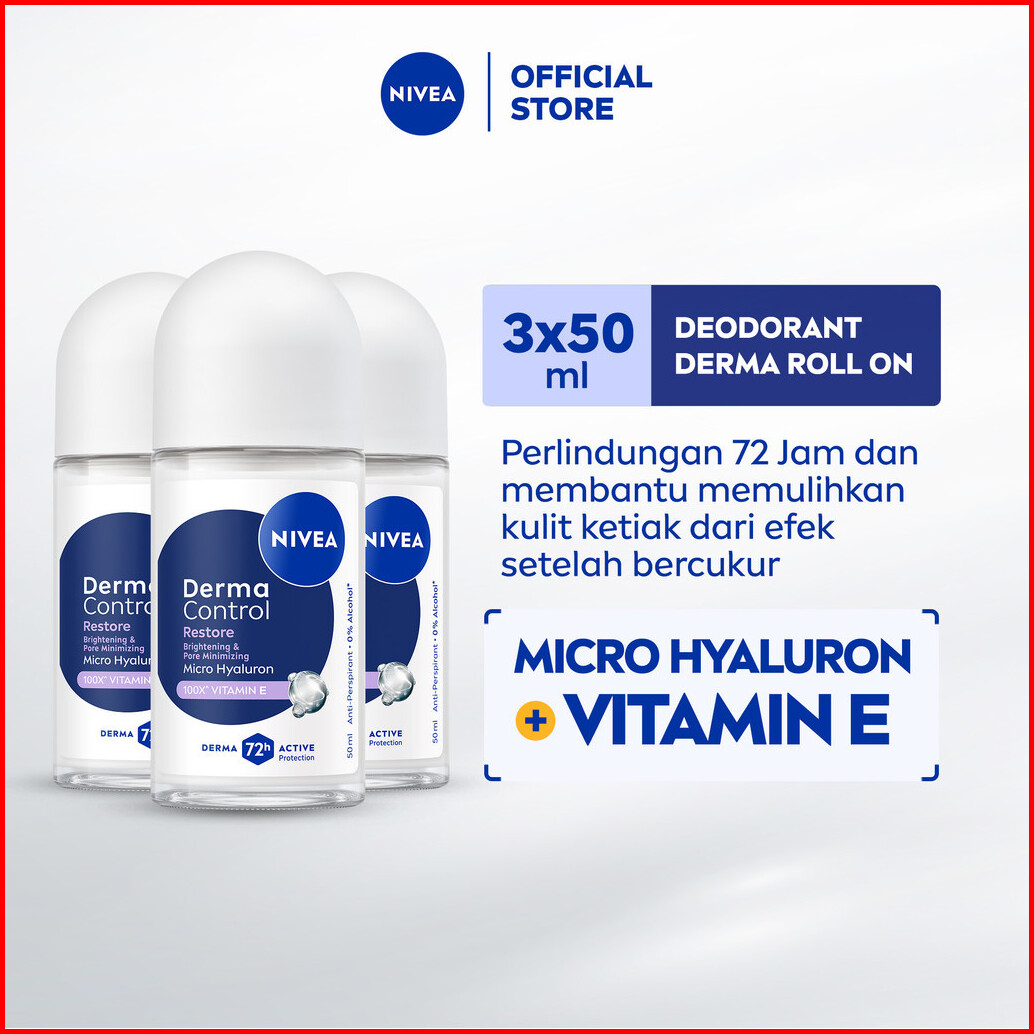 Nivea Deodorant Roll On Derma Control Restore 50ml X3 - Perlindungan 72 Jam Aman Untuk Kulit Sensitif Merawat Skin Barri