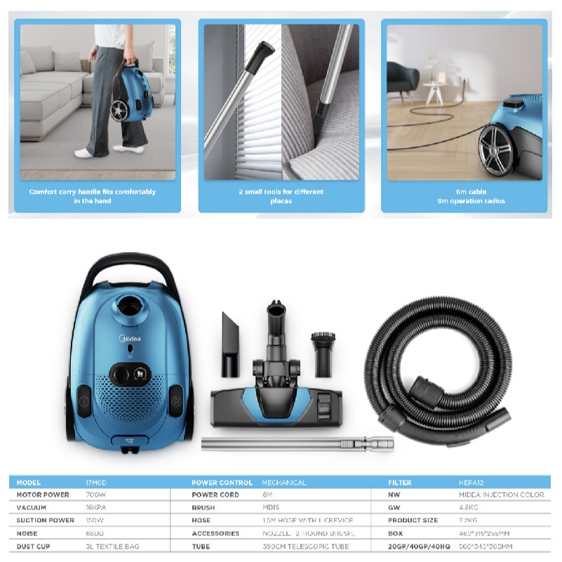 Midea Vacuum Cleaner MVC-17M | Bagged Canister Kantong Debu 3L | Suction Kuat 16 Kpa | Kabel Panjang 6M | HEPA12 Filter