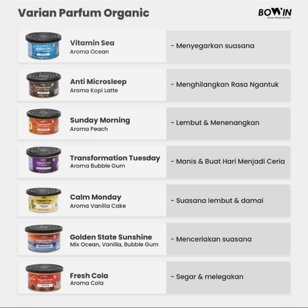 BOWIN PARFUM MOBIL & RUANGAN (Aromatherapy, Parfum,Pewangi Alami) Organic Can