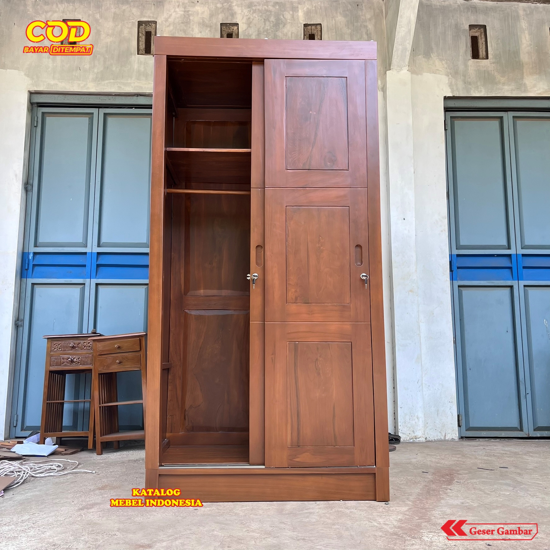 Lemari Pakaian Sliding 2 Pintu Kayu Jati Minimalis Modern - Lemari Baju Geser Anti Rayap Dengan Laci dan Rak - Wardrobe