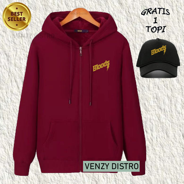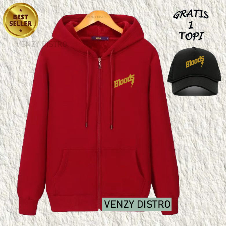 BONUS TOPI... Jaket Resleting Zipper Bloods Text Gold Premium Quality Sweater Tulisan Sweater Kata-Kata Hoodie Sablon
