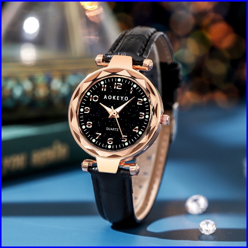 Aokeyo W157 Jam Tangan Wanita Original Santai Tahan Air Langit Berbintang Hitam Modis Jam Tangan Wanita Free Box Kartu G