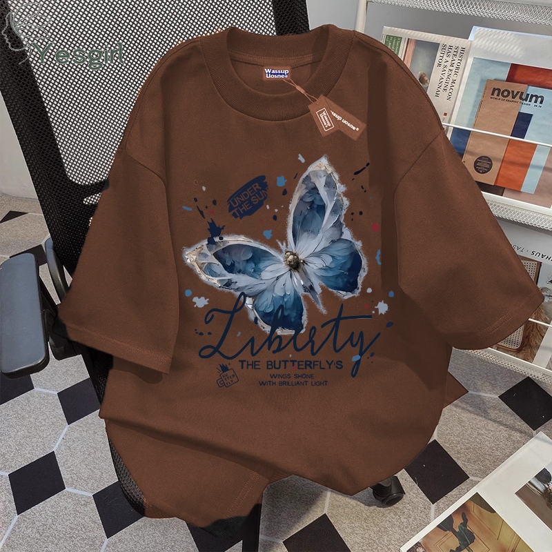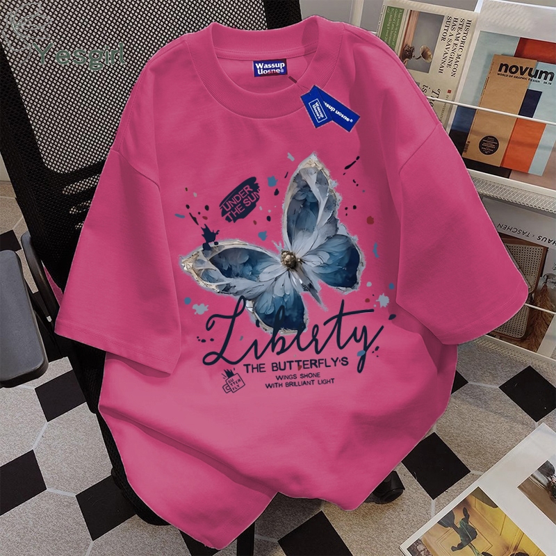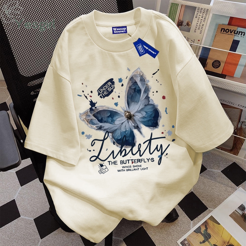 [Mall] Yesgirl Korea style “Vintage blue butterfly” print kaos kasual longgar| Kaos Oversize Wanita | Fashion korean style baju