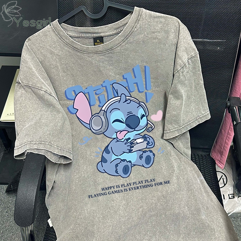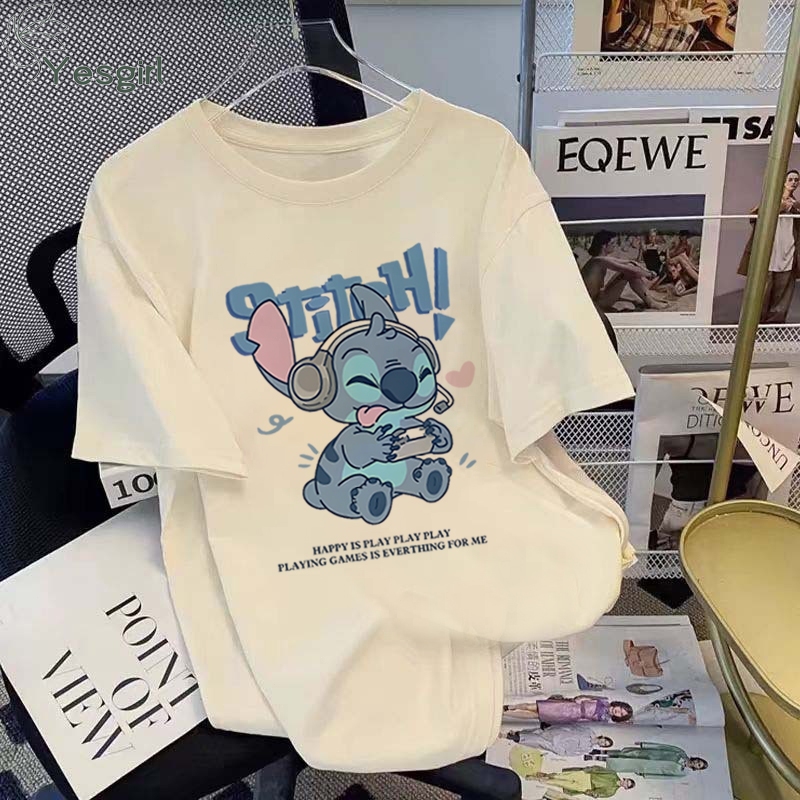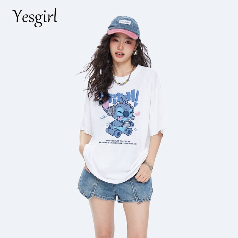 [Mall] Yesgirl Korea style “Happy Stitch” print kaos kasual longgar| Kaos Oversize Wanita | Fashion korean style baju kaos over