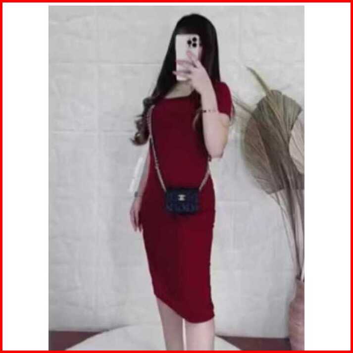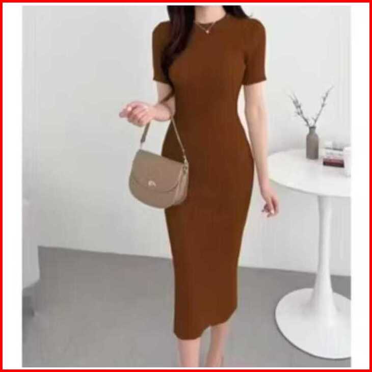 Midi Dress - Dress Knit Rib Elegant Dress Rajut Korean Style Fashion Dress Knit Lengan Pendek
