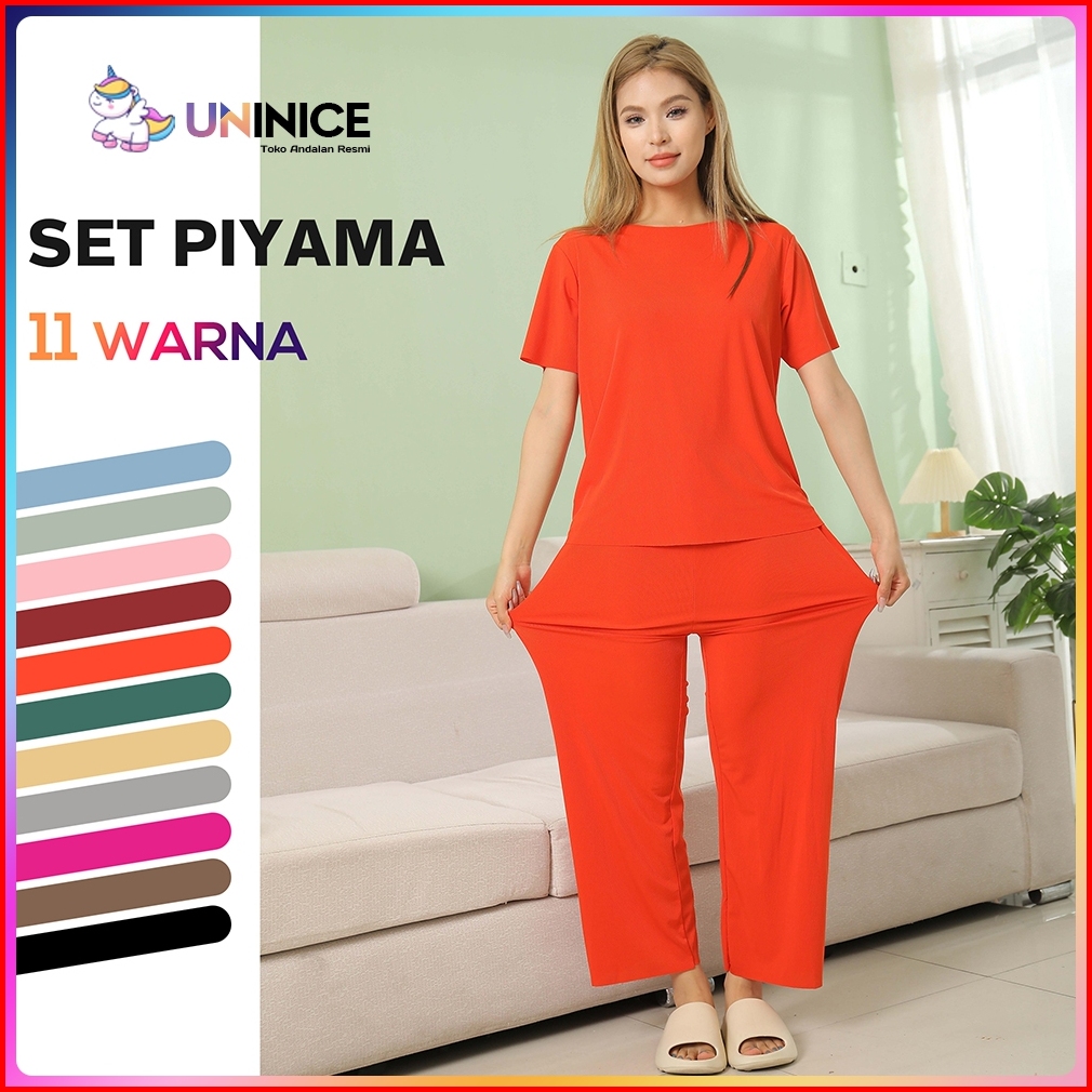 Uninice Set Piyama Longgar Wanita Warna Polos Bahan Sutra Es Kaus Dan Celana Sejuk Jumbo