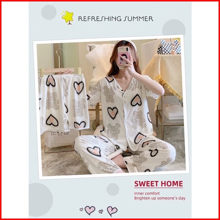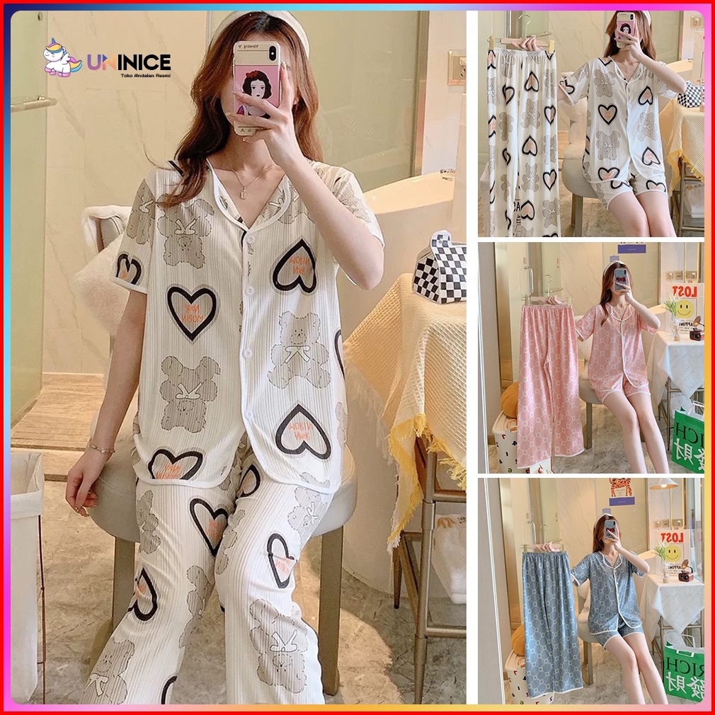 Uninice Piyama Wanita Tipis Bernapas Tiga Potong Set Pakaian Rumah Pendek Bermotif