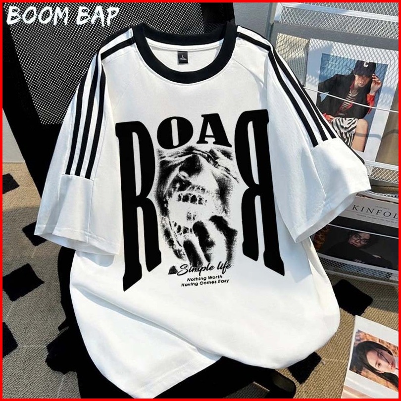 Boombap American Retro Style Tiga Bar T-shirt Oversize Roar Print Top Kaos Wanita Putih Kaos Pria Dan Wanita Street Styl
