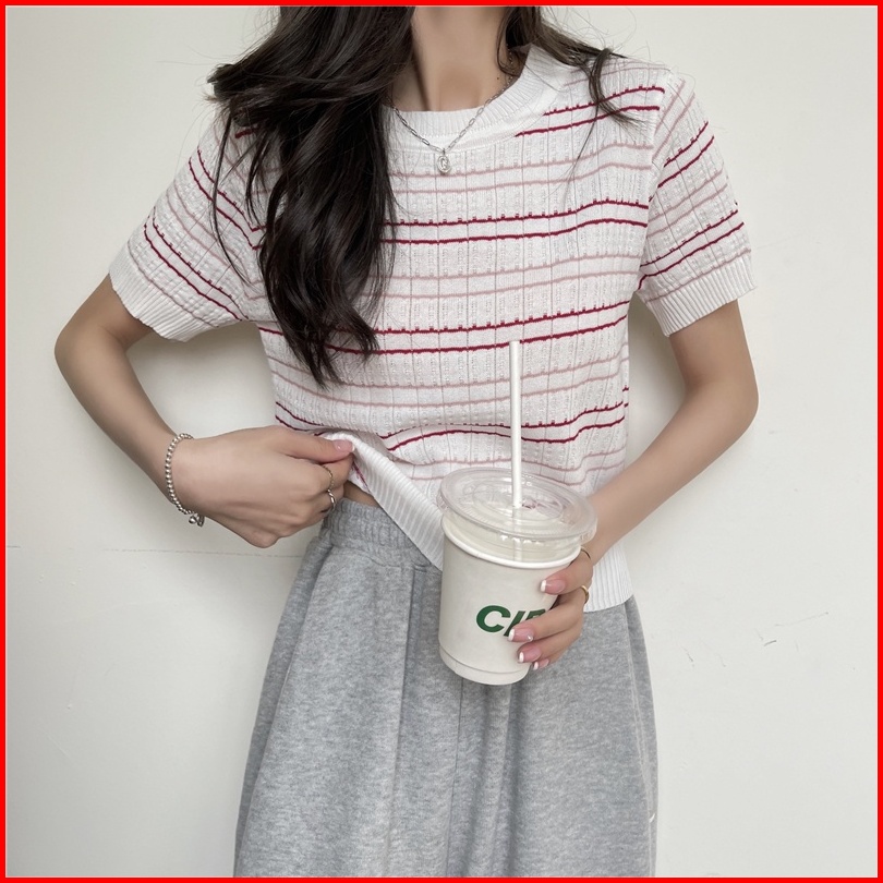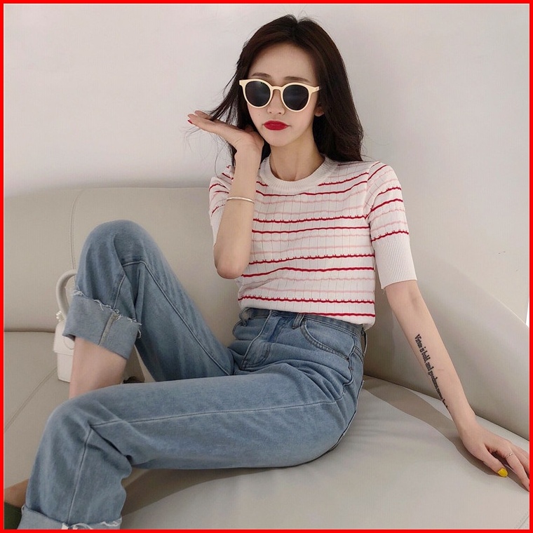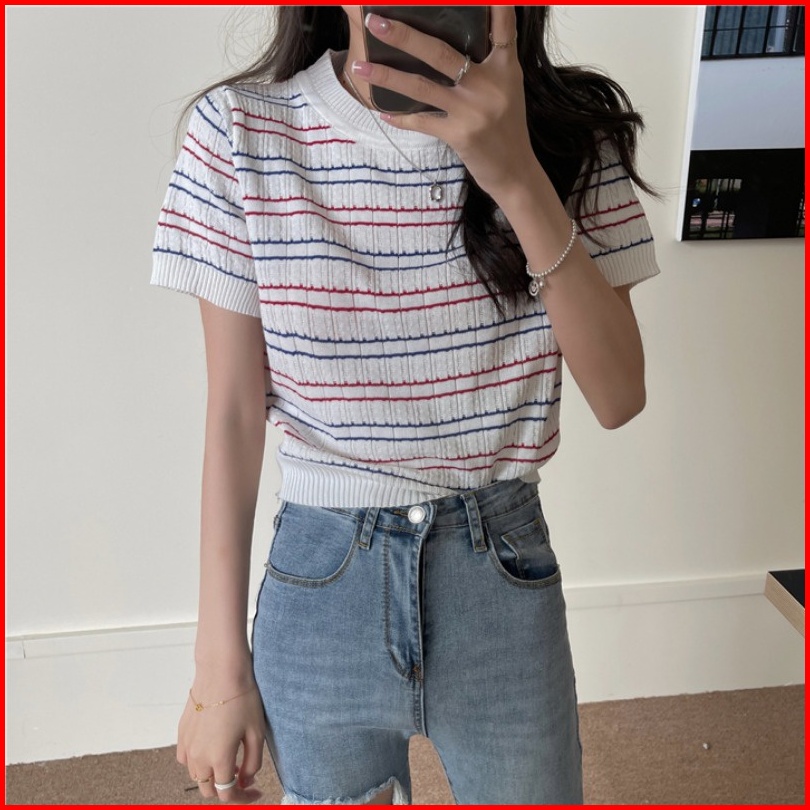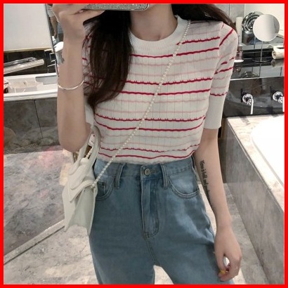 Xiaozhainv Korean Style Knit Stripe Kaos Atasan Wanita 3203