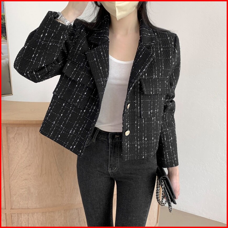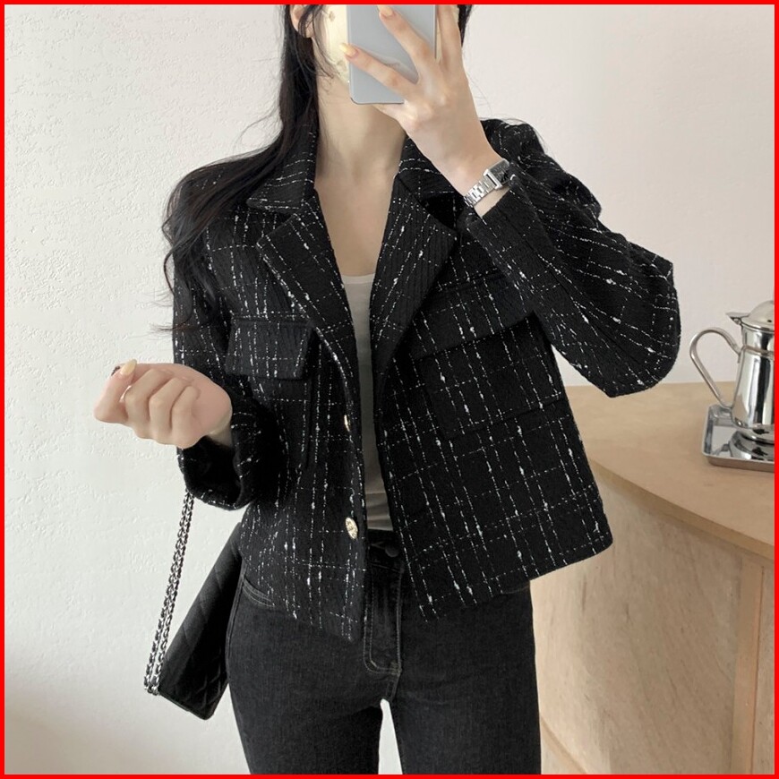 Po Floret Jaket Kotak-kotak Gaya Korea Cardigan Pendek Modis Serbaguna Untuk Wanita