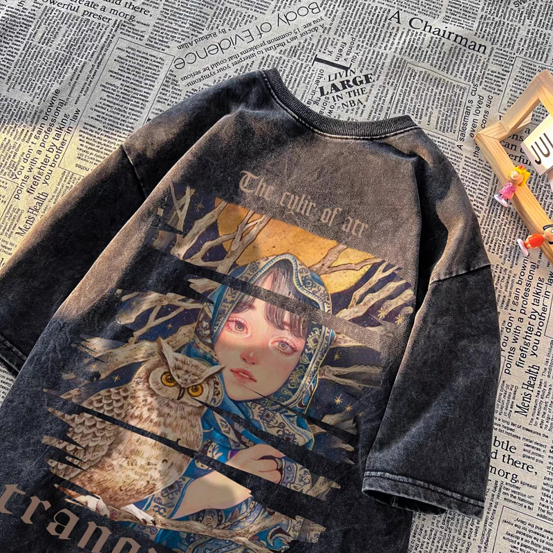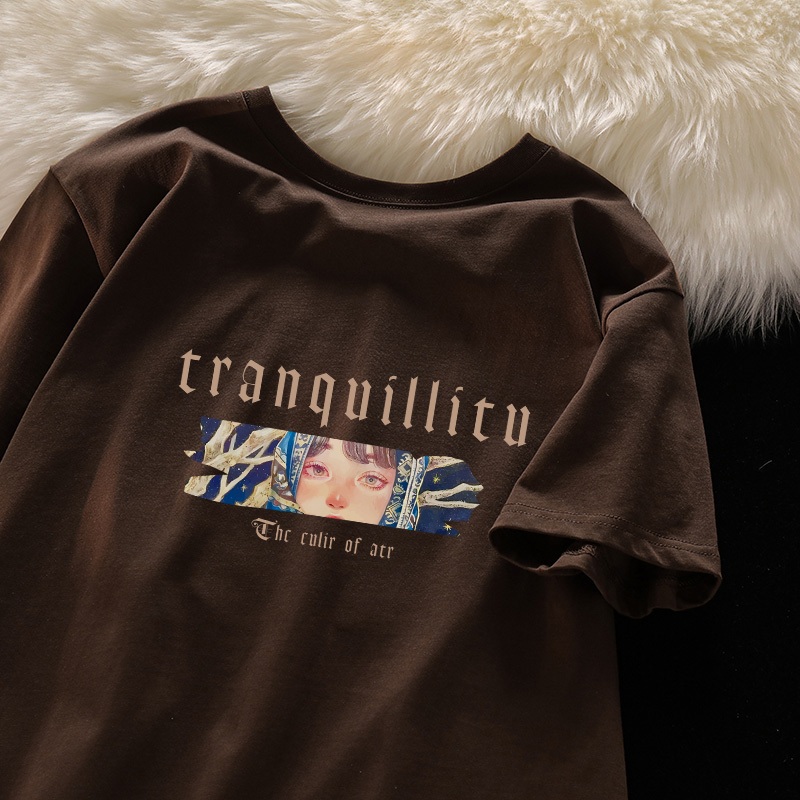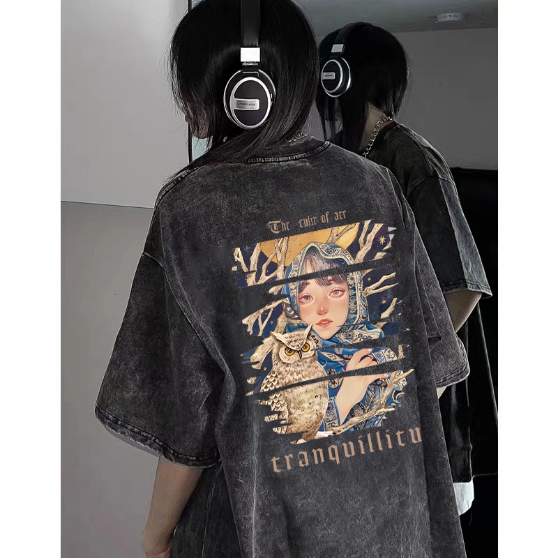 [Mall] Po floret Washed T shirt oversize lengan baju pendek Kaos retro girl katun murni wanita top Hitam