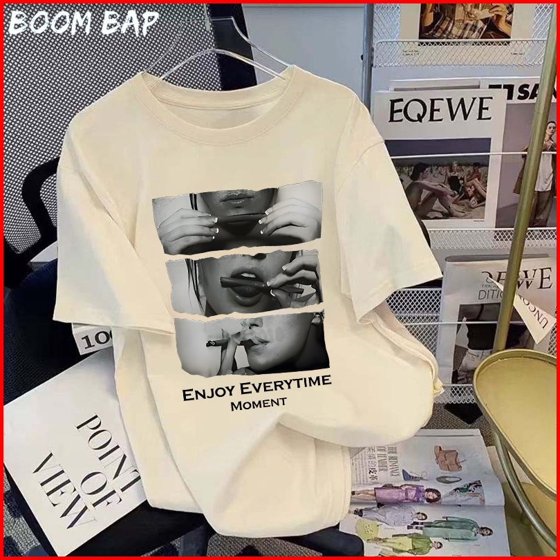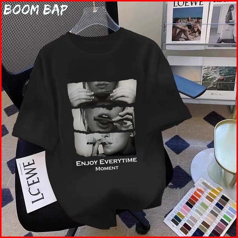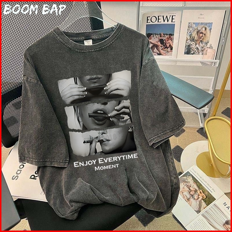 Boombap American Retro Style T-shirt Oversize Enjoy Everytime Moment Print Top Kaos Wanita Washed Hitam Kaos Pria Dan