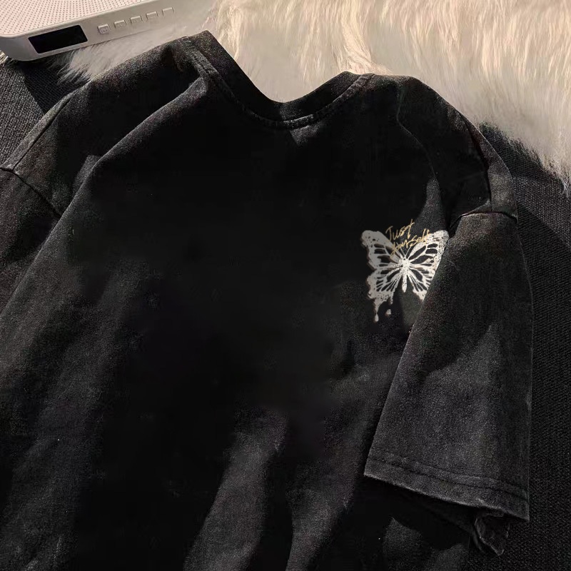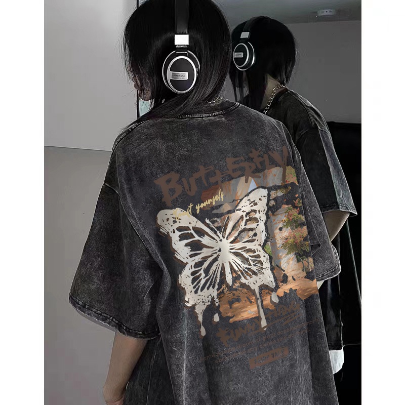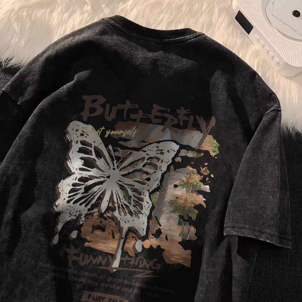 [Mall] Po floret Washed Kaos Oversize Lengan Pendek T-Shirt Oil painting butterfly Katun Murni Retro Style Baju Atasan Wanita T