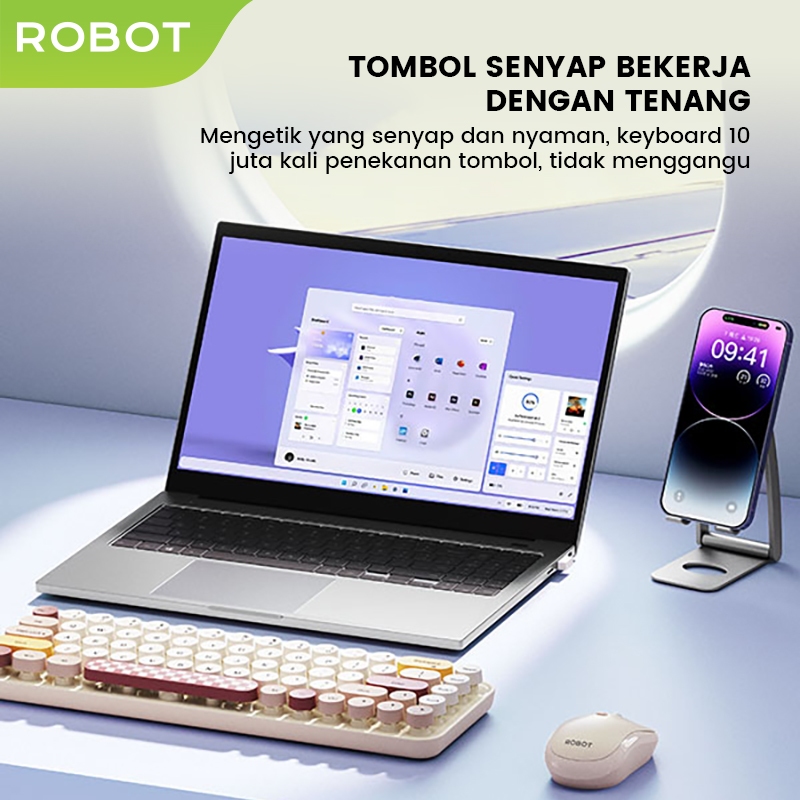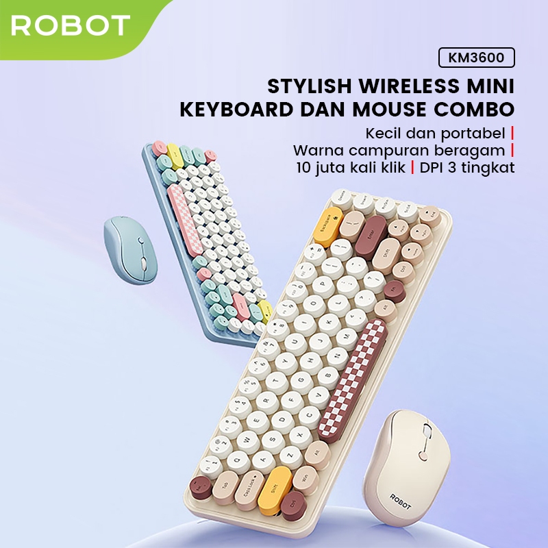 [Mall] ROBOT Combo Keyboard dan Mouse Wireless Set Pastel Colorful Mini Keyboard Mouse Set Senyap 2.4G Portabel KM3600 - Garansi 1 Tahun