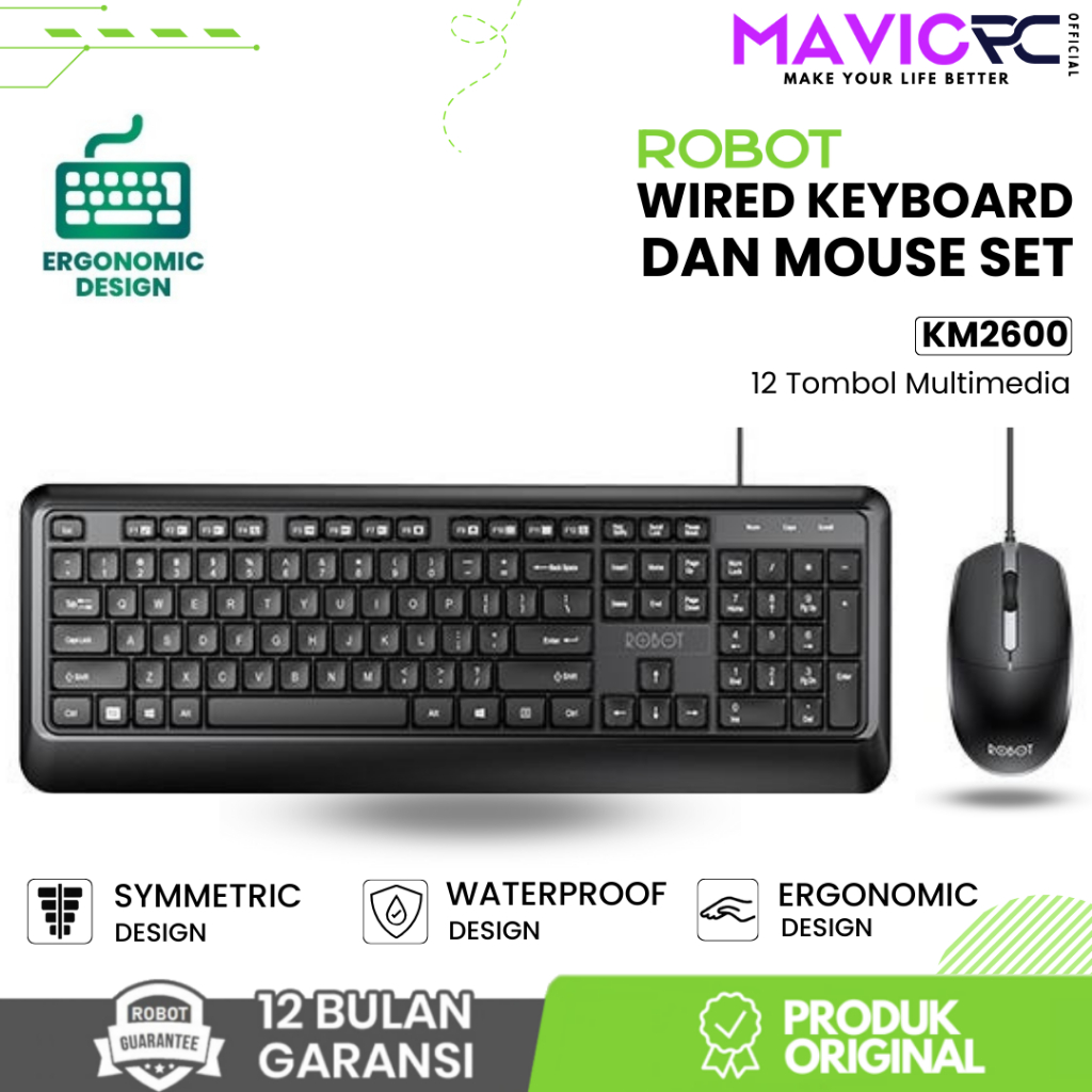 [Mall] ROBOT KM2600 Wired Keyboard & Mouse Kabel Combo Set 104 Key 1200 DPI Komputer / Laptop Garansi Resmi 1 Tahun