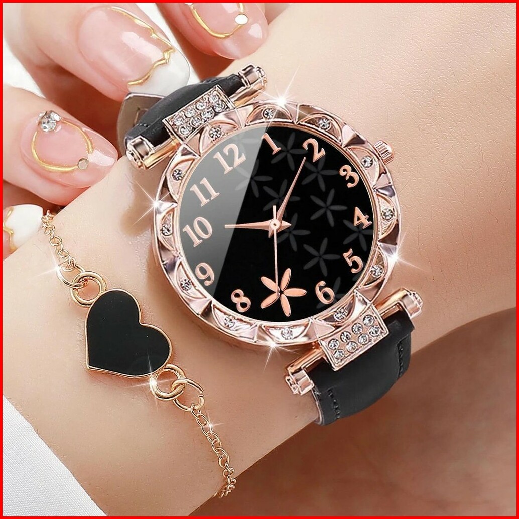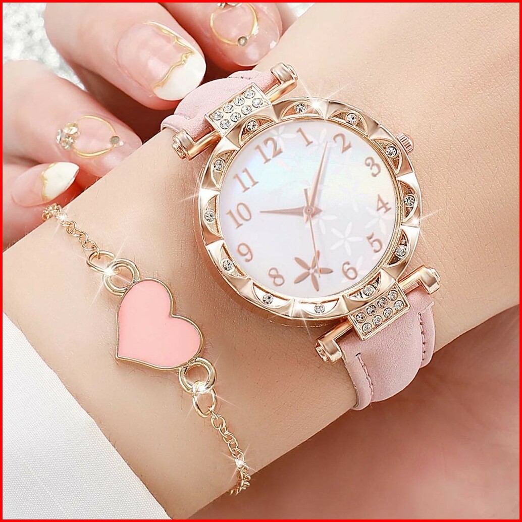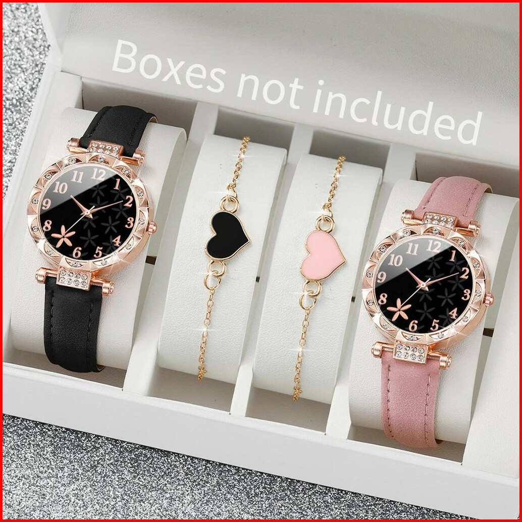 4pcs Set Jam Tangan Wanita Mode Bunga Dial Jam Tangan Kuarsa Jam Tangan Kulit Gelang Gelang Jantung Set Tanpa Kotak