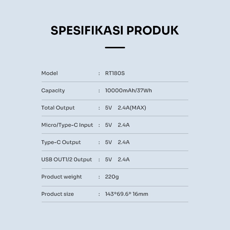 ROBOT Powerbank 10000mAh 3 Output Dual Input Type-C Power bank RT180S Fast Charging 12W Android/iPhone - Garansi 1 Tahun