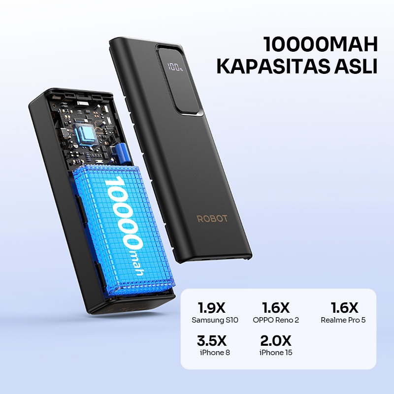 ROBOT Powerbank Fast Charging 10000mAh 22.5W Built IN Type-C Cable 60cm Dual Input dan Dual Output With LED Display Pow