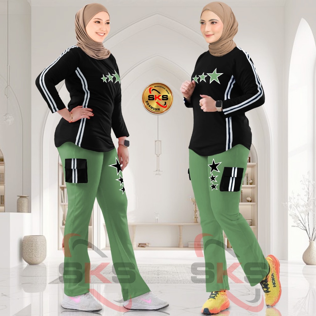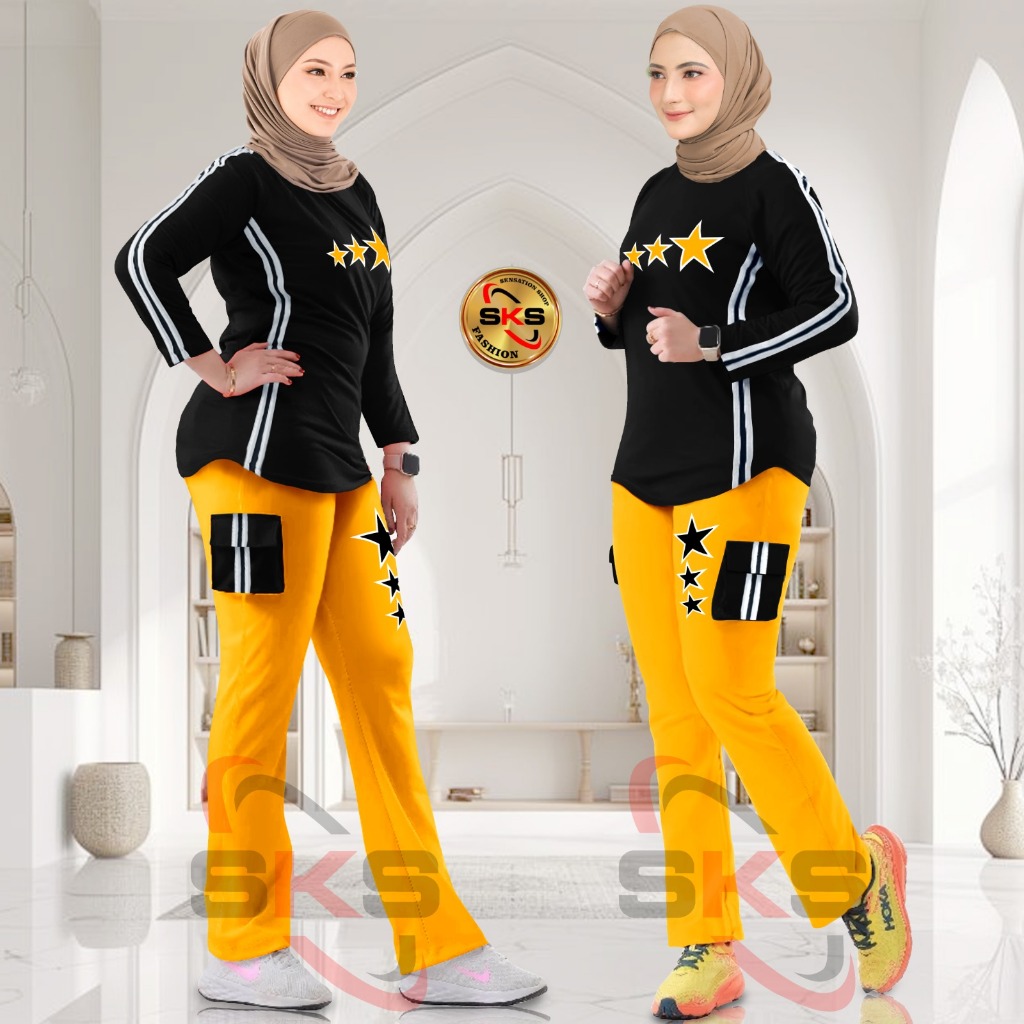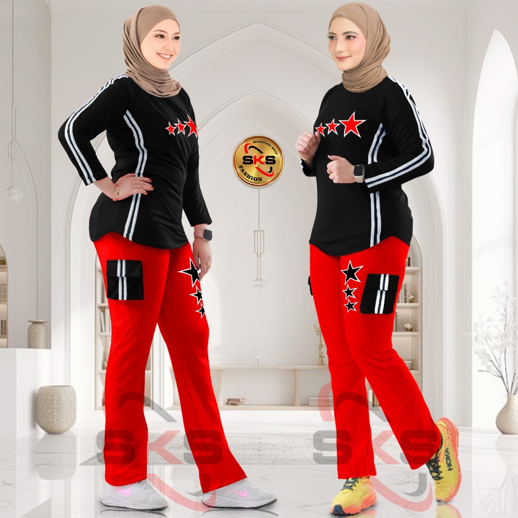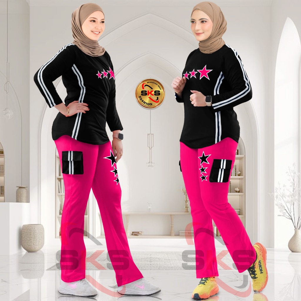 Setelan Olahraga Wanita Kombinasi Celana Cargo Sporty Motif Star Bintang Set Training Senam Oneset Joging Running Kekini