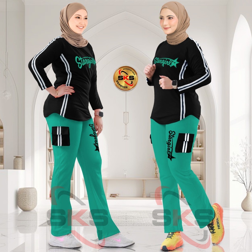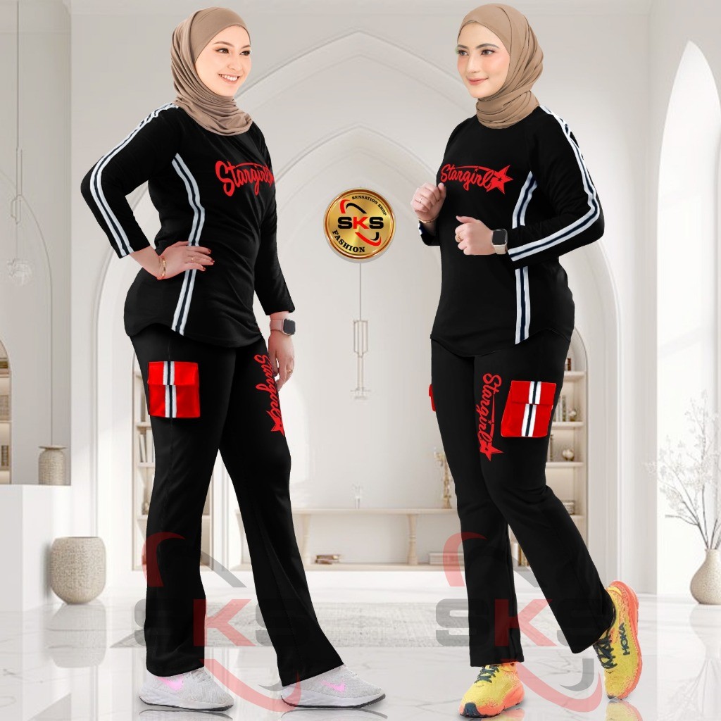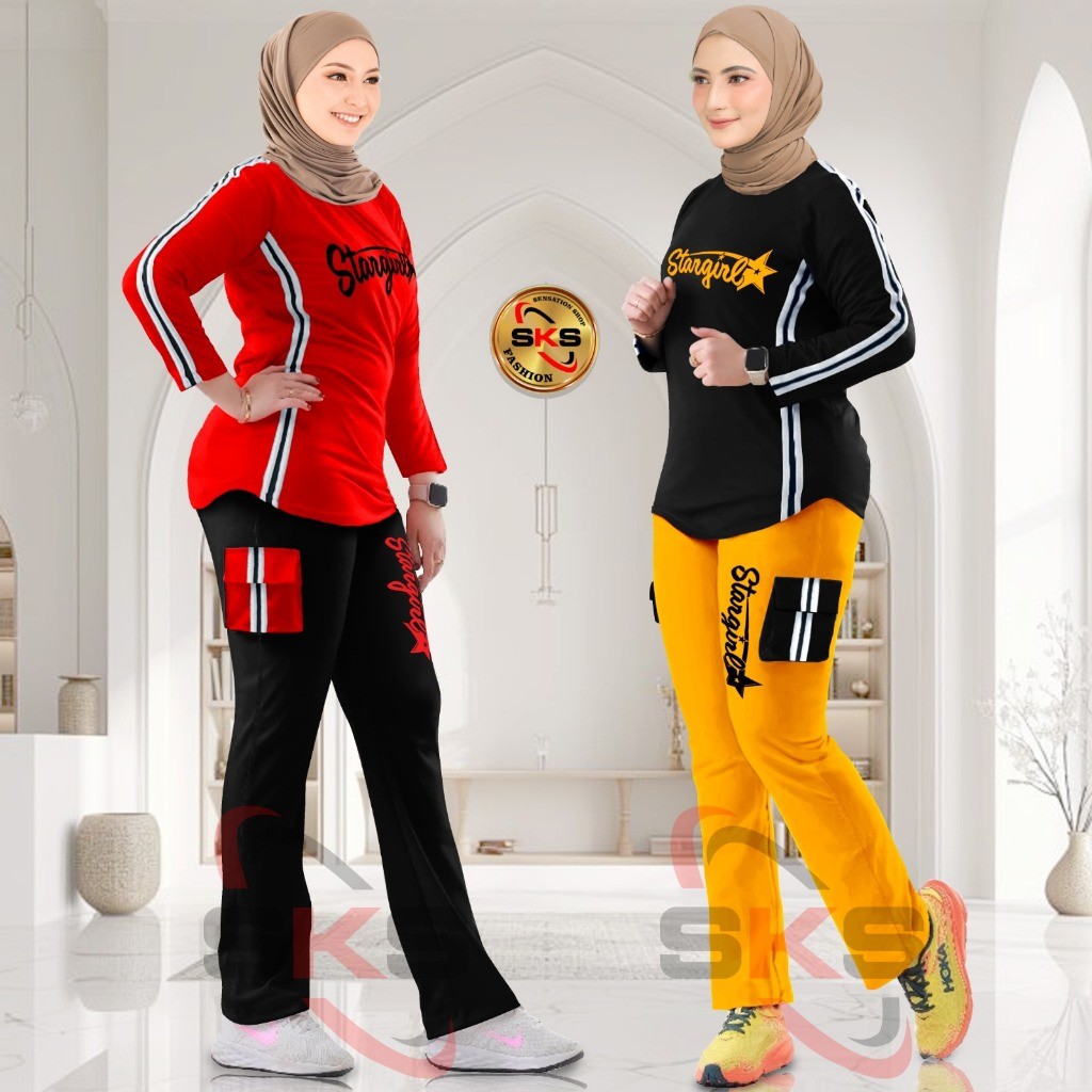 Setelan Olahraga Wanita Kombinasi Celana Cargo Sporty Motif Starggirl Set Training Senam Oneset Joging Running Kekinian