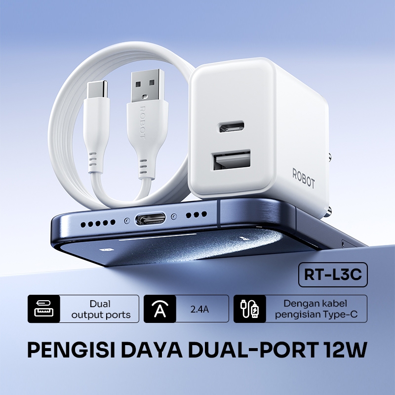 ROBOT Adaptor Charger 12W Fast Charging Dual Port with Micro USB Type-C Cable 2.4A Kepala Charger for Android iPhone RT-