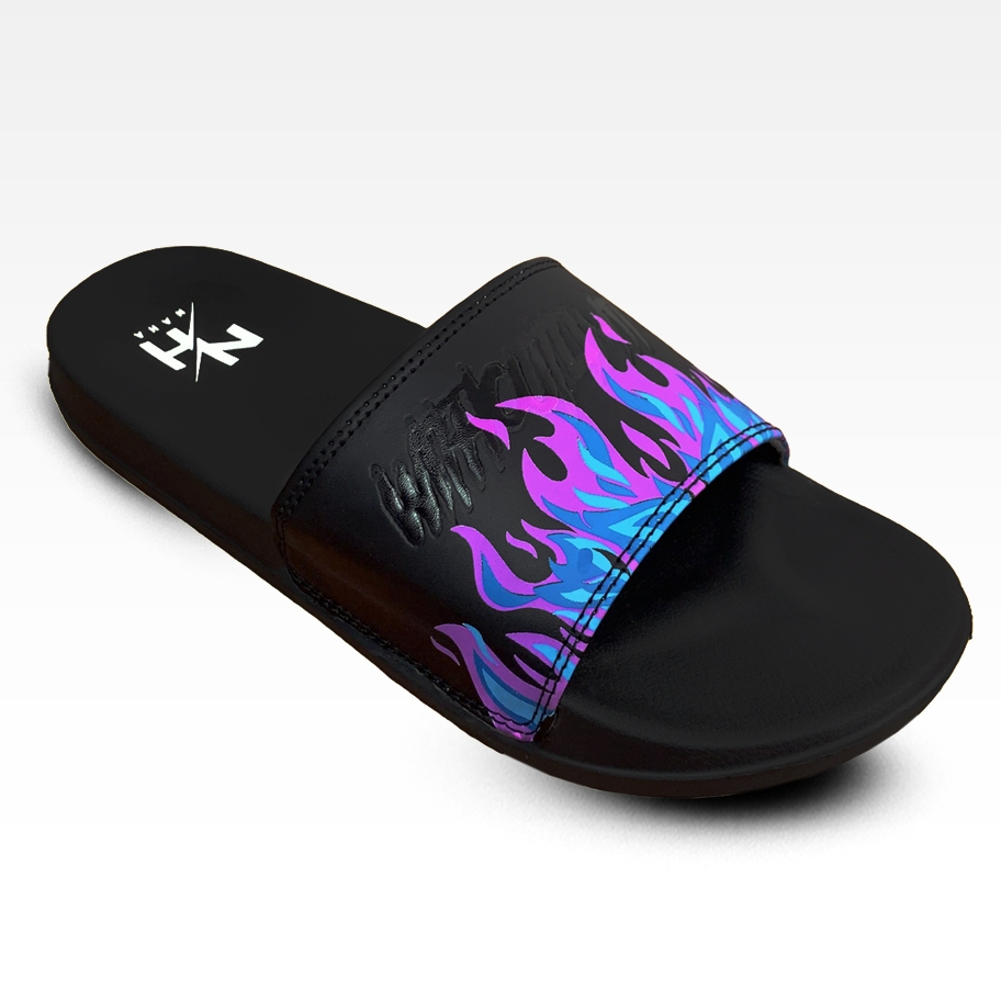 Sandal Slop Pria Wanita Distro Karet Motif Api Ungu Hitam Sandal Keren