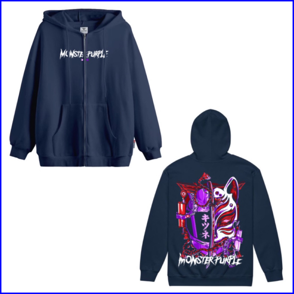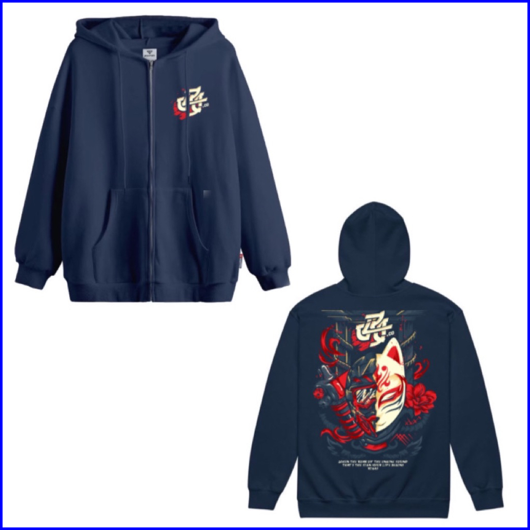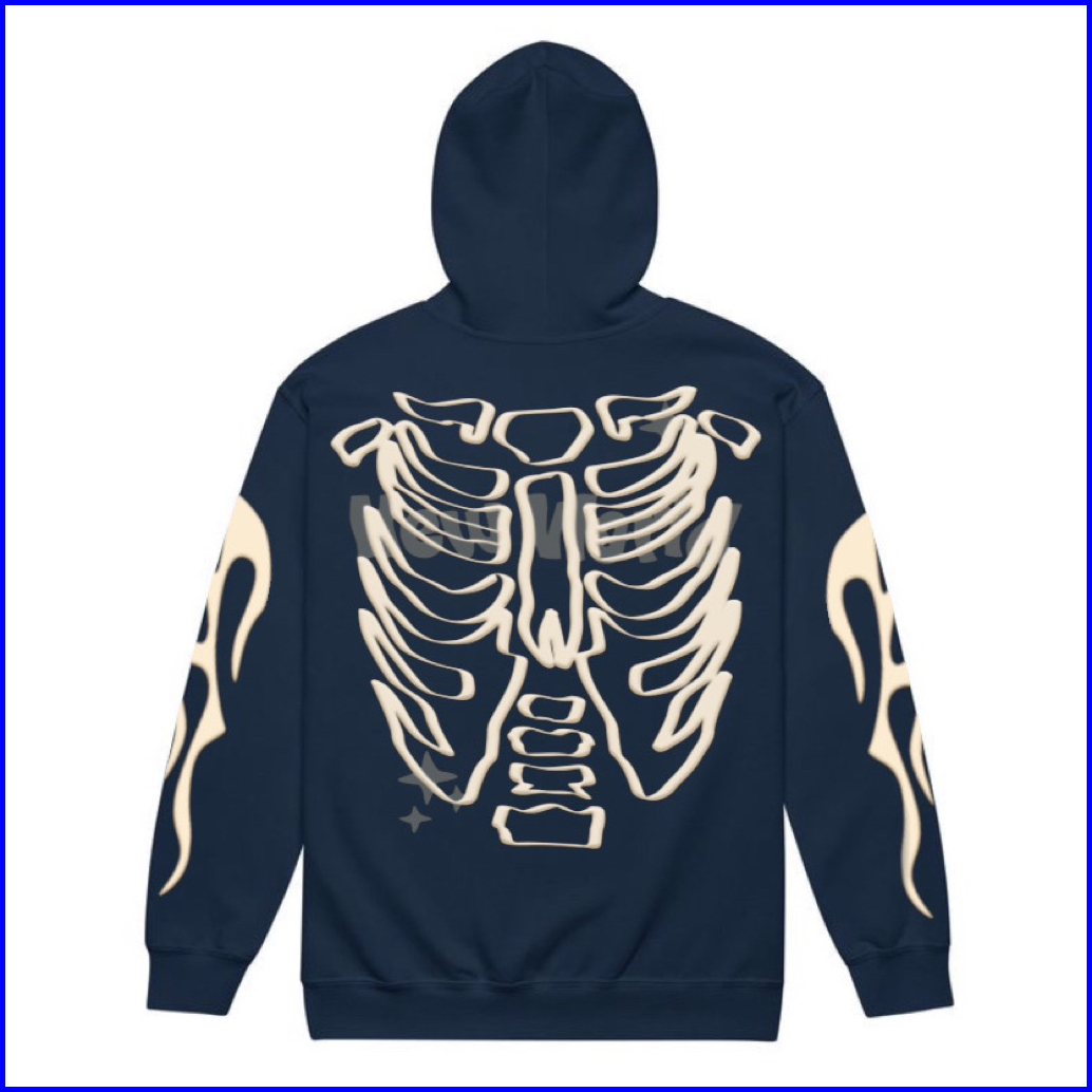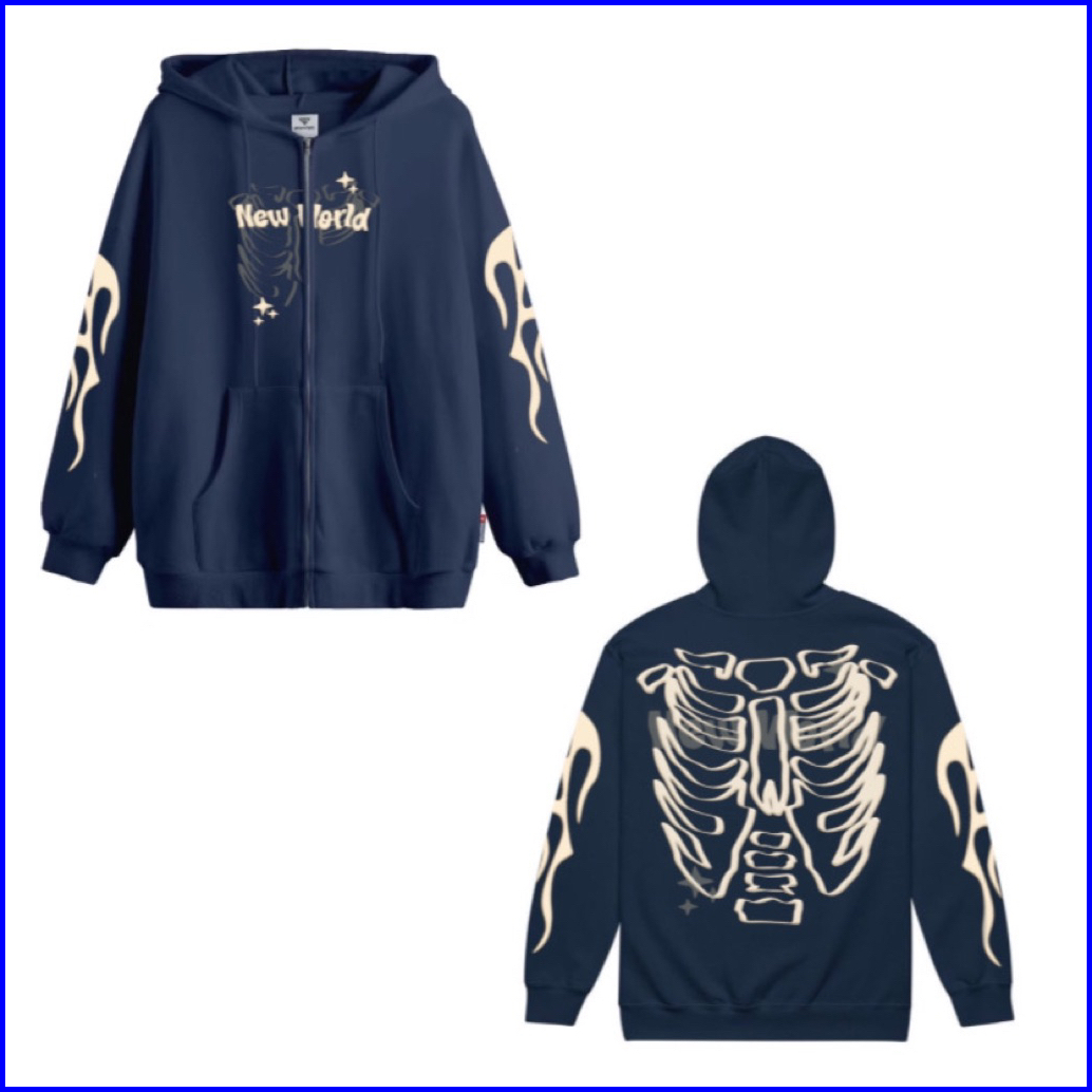 Bleesed X Hoodie Ziper Navy Pria Wanita Unisek Sweaters Hodie Tebal Gramasi 280 Lembut Motif Tulang New World
