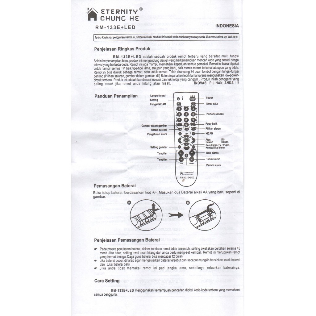 REMOTE REMOT TV UNIVERSAL TABUNG CHUNGHE RM 133E+LED