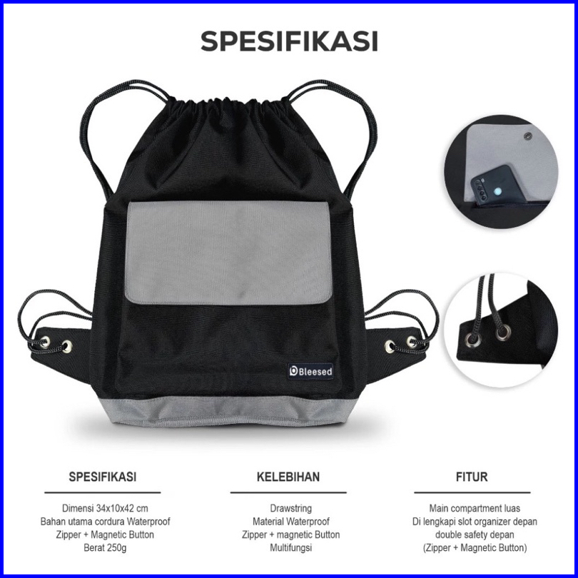 Bleesed - Backpack Sekolah Combinasi Hitam Abu Tas Serut Cordura