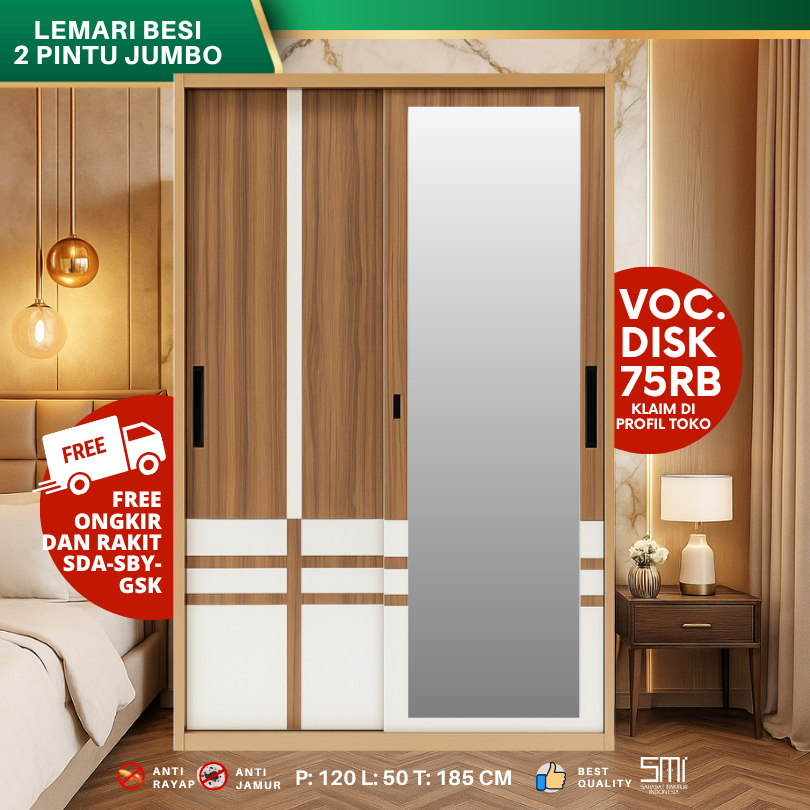 Lemari Pakaian Besi 2 Pintu Sliding Door 120 JUMBO, Lemari Baju Full Besi, Metal Wardrobe Sliding Gratis Ongkir