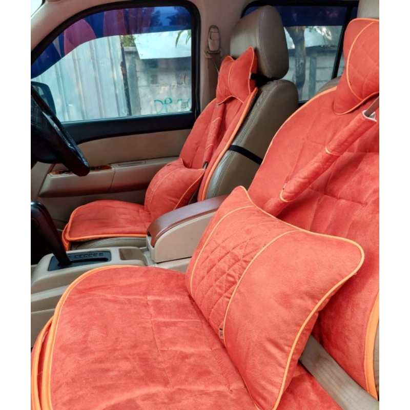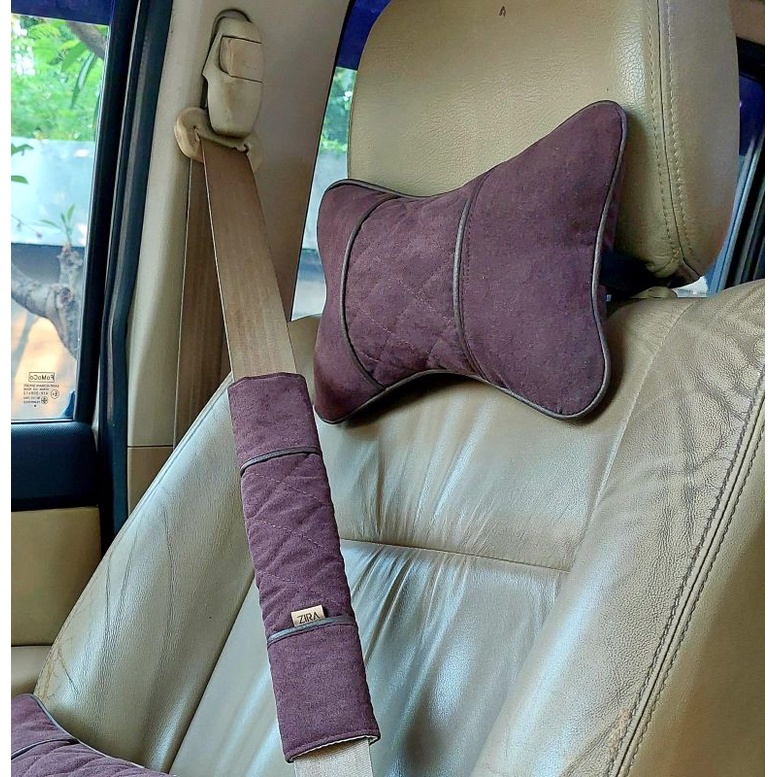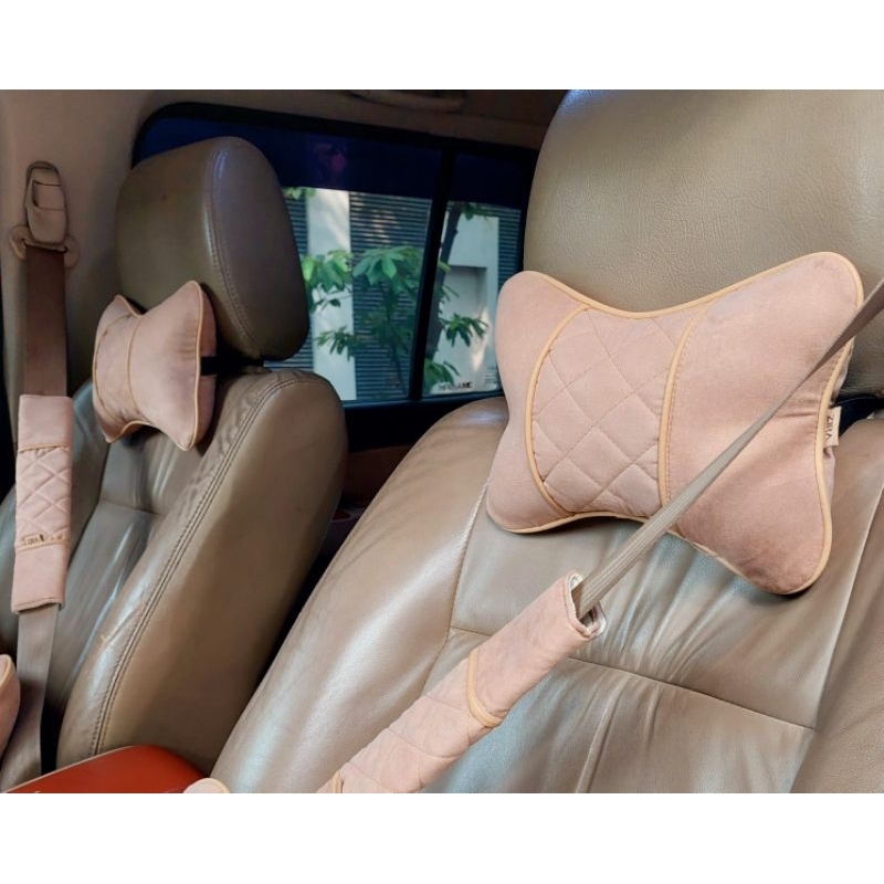 Bantal Mobil Satu Set Isi 4 Pcs 2 Headrest 2 Cover Seatbelt Bahan Kanvas List Kulit Sintetis Oscar