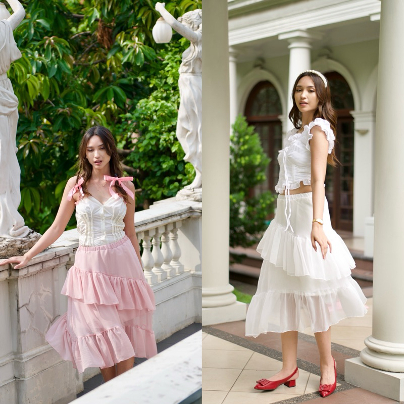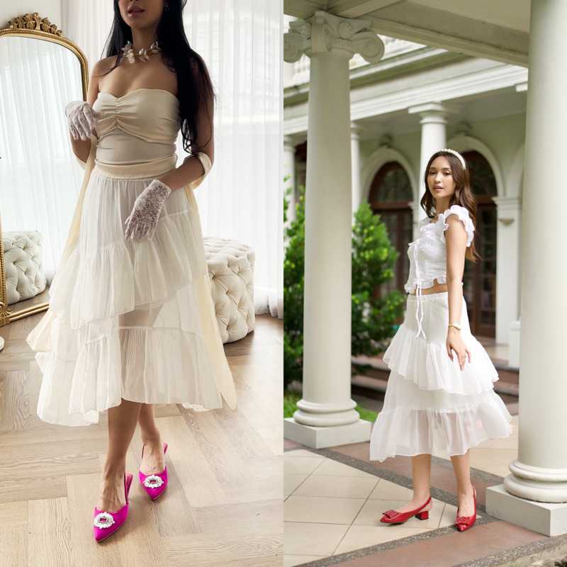 Estelle Skirt Swuave Wear swuave.wear Flowy Puffy Flow Puff Asymmetrical Ruffled Tiered Midi Skirt with Chiffon Fabric E