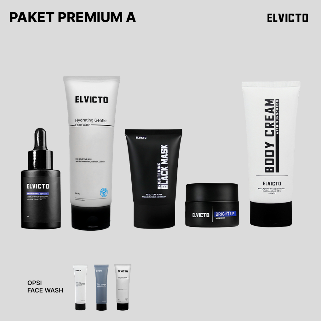 SKINCARE PRIA ELVICTO PAKET PREMIUM WITH BRIGHT UP MOIS,SERUM PEMUTIH,BLACK MASK,FACIAL WASH,BODY CREAM BPOM