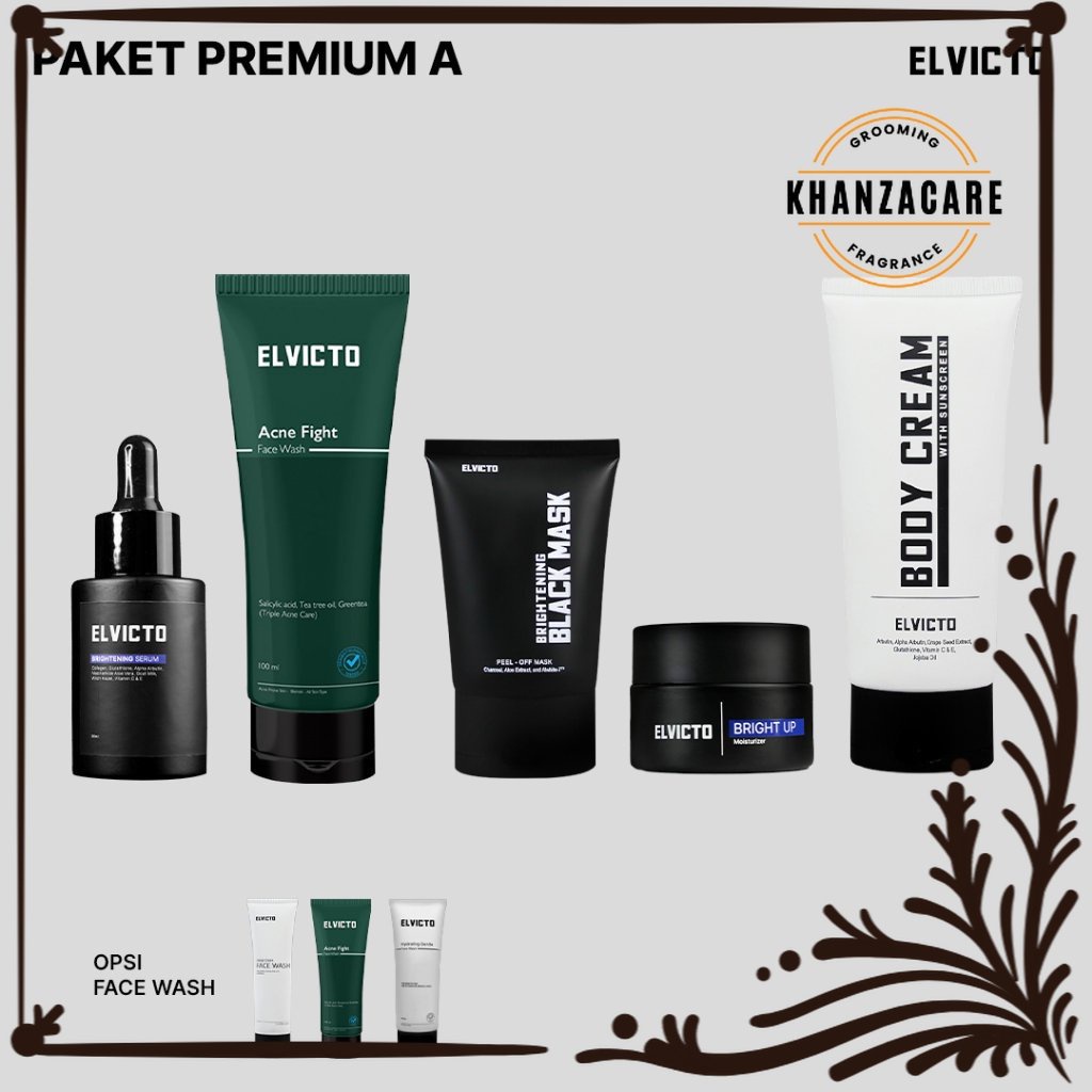 SKINCARE PRIA ELVICTO PAKET PREMIUM WITH BRIGHT UP MOIS,SERUM PEMUTIH,BLACK MASK,FACIAL WASH,BODY CREAM BPOM