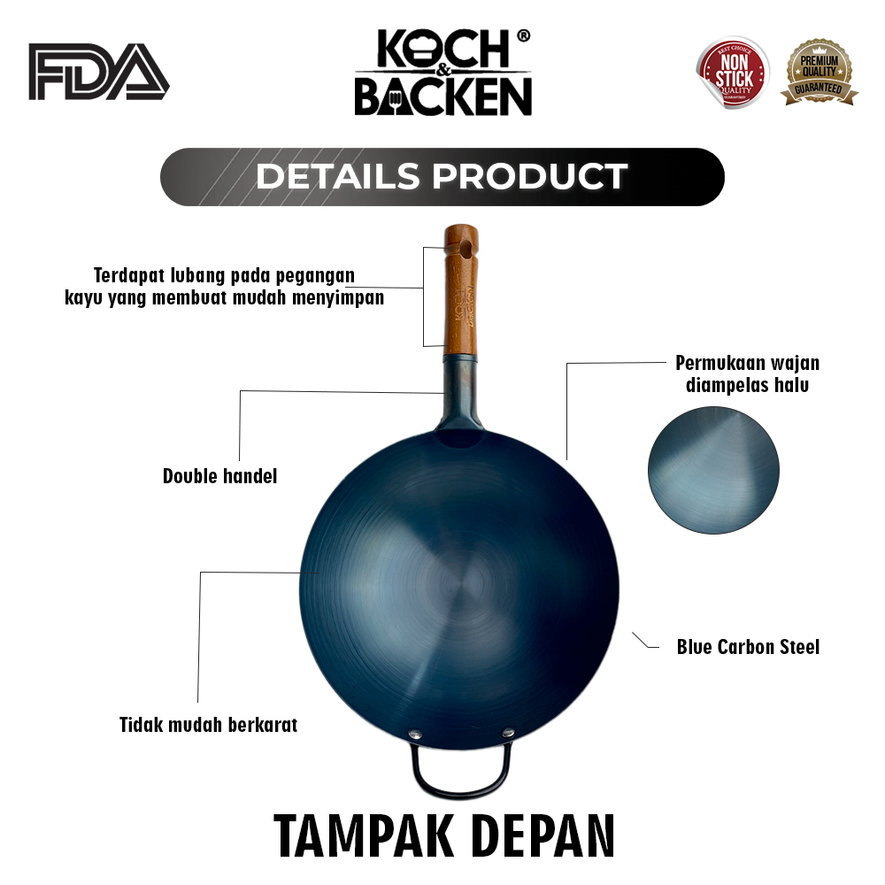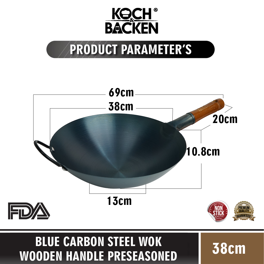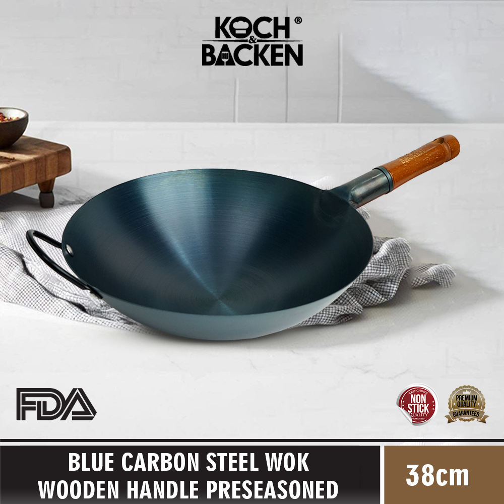 KOCH&BACKEN Blue Carbon Steel Wok Wooden Handle Preseasoned 38cm - Wajan Kuali Penggorengan Baja Gagang Kayu Anti Lengke