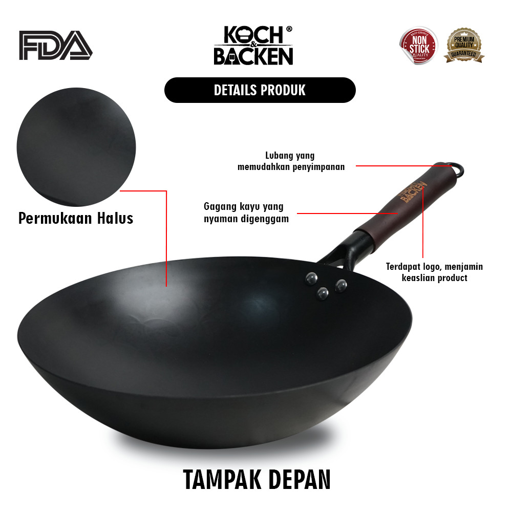 KOCH&BACKEN Carbon Steel Wok Deep Nitriding Round Bottom 30cm with Wooden Handle
