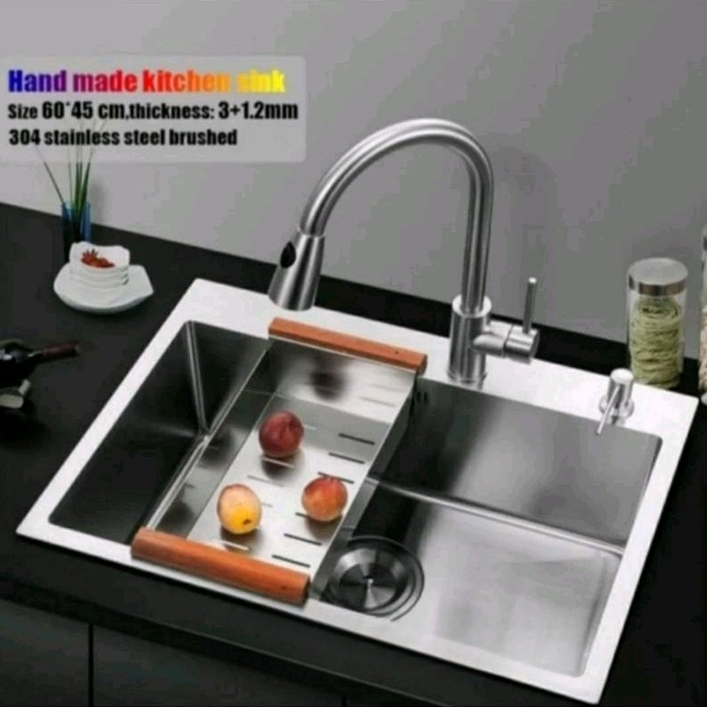 Paket Lengkap Kitchen Sink 6045 Stainless HANDMADE + KRAN PIPA TARIK SUS 304 /Bak Cuci Piring Minimalis