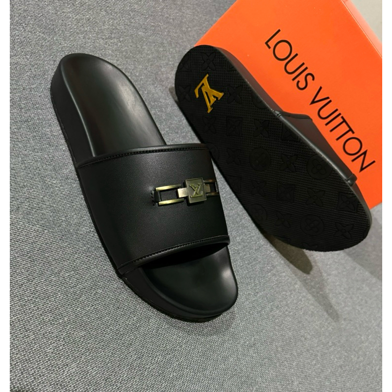 sandal slip on premium || MIROR LP 123|| motif polos asesoris logo besi lv hitam polos+fre boxs