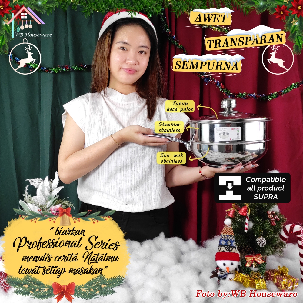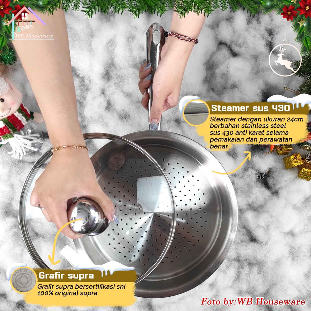 SUPRA Panci stir wok set 24cm + steamer + tutup kaca viliron stainless steel SUS 304 professional chef series / penggore