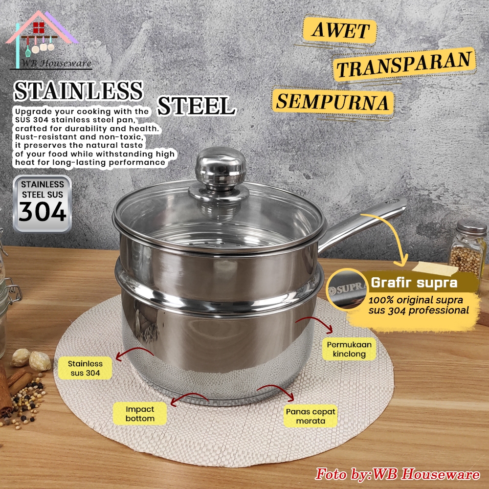 SUPRA Panci Sauce pan 20cm stainless SUS 304 + steamer + tutup kaca professional series impact bottom / wajan masak mie