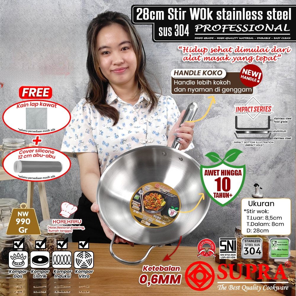 SUPRA New panci Stir wok 28cm stainless SUS 304 professional impact series / wajan masak penggorengan