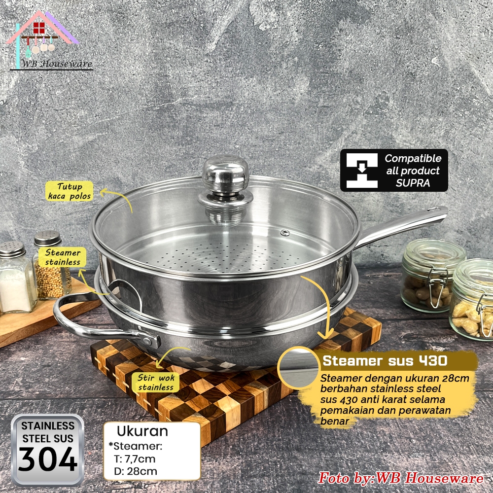 SUPRA New panci Stir wok 28cm + steamer + tutup kaca viliron stainless SUS 304 professional impact series / wajan masak