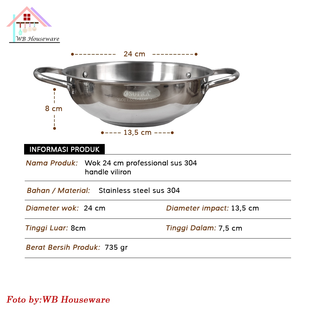 SUPRA wok 24cm + steamer + tutup stainless steel impact SUS 304 professional series / panci wajan penggorengan handle ku