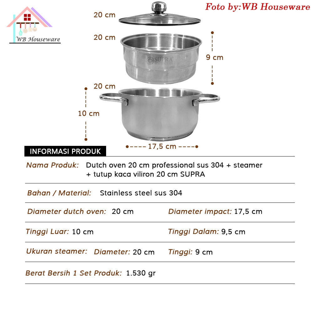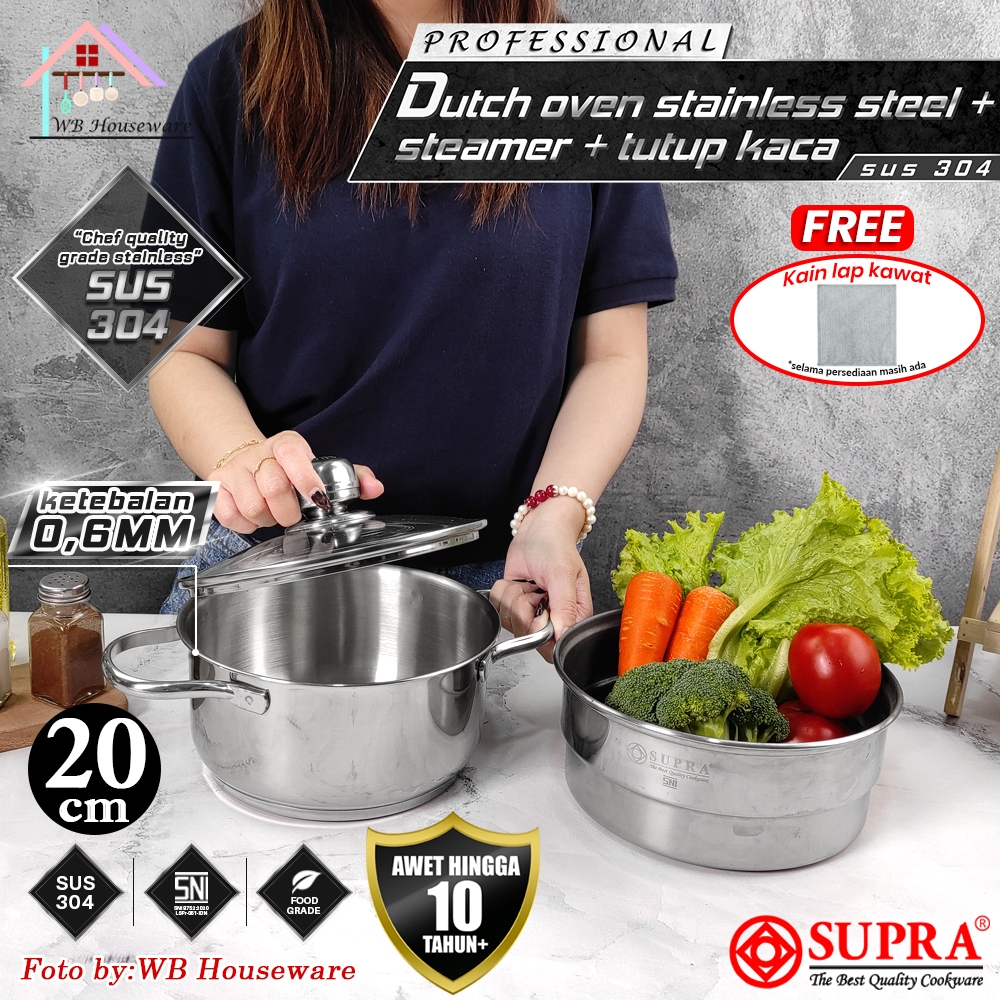 SUPRA Panci dalam dutch oven 20cm + kukusan stainless steel SUS304 Professional series impact bottom / wajan
